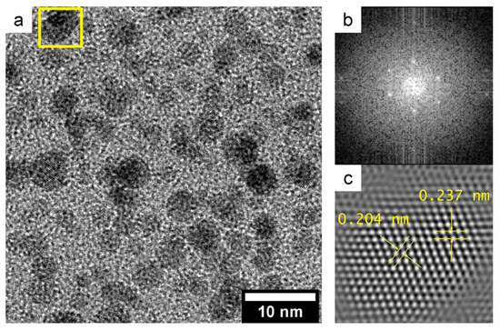A typical TEM image of synthesized gold nanoparticles is shown in Figure 1a. As can be seen, the particles are spherical. NPs are crystalline and have lattice spacing of 2.37 Å and 2.04 Å of 111 and 200 lattice, respectively. The average size of the NPs is 4.6 ± 0.8 nm. Other TEM images of gold nanoparticles are exhibited in Figure S1. The average sizes are from 0.7 to 40.1 nm. During the preparation of catalysts, gold nanoparticles were heated. This could lead to a change in their sizes. However, we have previously shown that no significant changes in the nanoparticle sizes were observed at temperatures below 573 K [19]. Also, molecular dynamics calculations have shown that coagulation does not occur [30] and the particles remain in their initial shapes in the low-temperature region [31].