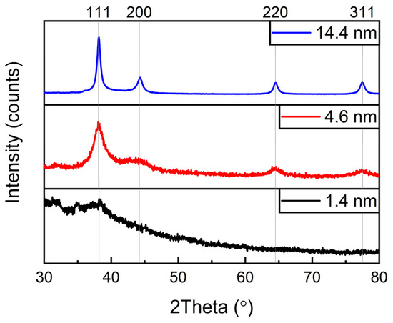 The crystal structure of NPs was also examined by powder XRD, as shown in Figure 2. It can be seen that the XRD spectra exhibit evident diffraction peaks at ca. 38.2°, 44.2°, 64.5°, and 77.5°, which could be indexed well to the 111, 200, 220, and 311 facets of the typical fcc phase of gold (JCPDS no. 04-0784), respectively [32,33]. It should be noted that particles smaller than 2 nm are amorphous, and the spectra show only one broad reflection at 38.2° [34]. The electron diffraction and XRD data are in good agreement.