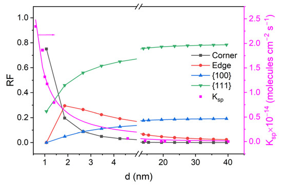 The contribution of each type of atom in due time depends on their relative fraction on the surface of the particle and depends on its size. For small sizes of gold NPs (less than 5 nm), the relative fraction (RF) of corner atoms (the CN ≤ 6) tends to 100% (Figure 3). In addition, the RF of edge atoms for NPs less than 2 nm decreases, and for clusters less than 1.1 nm (24 atoms CN = 6 and 8 atoms CN = 9), almost all surfaces consist of atoms with CN ≤ 6. In this case, the contribution of the reaction rate constant for edge atoms (Ke) can be neglected, and the overall rate constant (Ksp) is equal to the rate constant for corner atoms (Kc) (Equation (4)).
