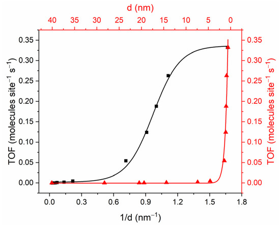 At particle sizes of 14.4 nm or greater, edge atoms represent a significant proportion of the low-coordinated gold atoms. Conversely, at particle sizes of less than 1.5 nm, corner gold atoms are the predominant sites. At these sites, gold atoms with different CNs exhibit markedly different catalytic activities with respect to hydrogen isotope exchange. Figure 4 shows the plots for the TOFs per surface atom versus degree of dispersion (d−1) and particle size. As can be seen, TOF increases exponentially with an increasing degree of dispersion. This behavior is named sympathetic structure sensitivity. Such dependence is related to the different adsorption behaviors of reactants on different crystal sites, namely on faces, corners, edges, or interfaces of the metal support on the metal NP surface, since their RF change significantly with particle sizes in the range of 1–10 nm, which critical important for catalysis [44,45]. It is important to note that the dependence of the catalytic activity on the Au particle size to a higher density of low-coordination atoms, the TOF per active atom, does not depend on the particle size. This is true for both small and large particles [37].
