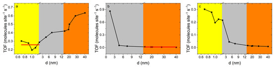 Dependence of turnover frequency vs. diameter of particles: corner atoms (a), edge atoms (b) and sum of corner and edge (c) atoms. Highlighted colored zones show the ratio of the number of corner and edge atoms. Yellow—Nc ≥ Ne; grey—Nc ≈ Ne; orange—Nc ≤ Ne.