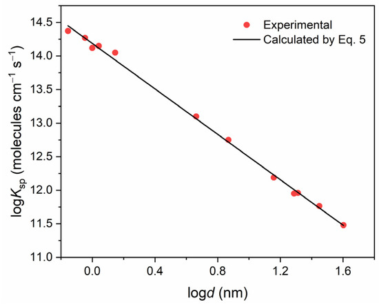Figure 3 shows the variation in Ksp as a function of particle size, illustrating the increase in the specific activity with decreasing size. The plot consists of two sections: smooth growth of the catalytic activity as the particle size decreases from 40 nm to approximately 5 nm (Figure 3). A similar dependence was previously observed [12,36,37,38]. The slow growth section is replaced by a sharp increase in the activity for particles less than 4 nm (Figure 3, magenta curve). Hence, the size of gold particles proves to be the factor responsible for the specific catalytic activity. It follows from Figure 3 that the specific catalytic activity Ksp at 77 K drastically and exponentially decreases by a factor of approximately 2500 as the particle size increases from 0.7 nm to 40 nm. This is caused by a sharp increase in the concentration of low-coordination gold atoms on the surface of gold nanoparticles. It should be noted that, when the particle size is less than 1.1 nm, all surface atoms are low coordinated (CN ≤ 6).