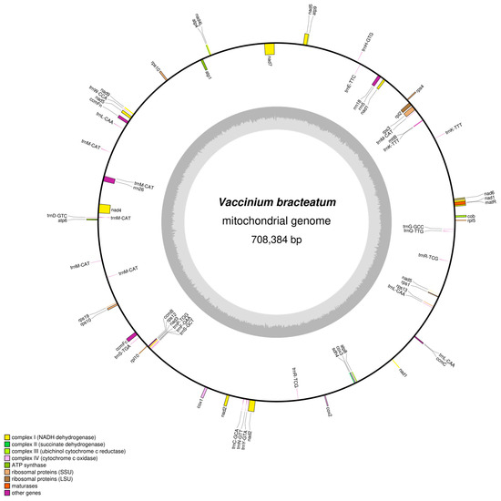 Circular map of the V. bracteatum mitogenome. Genes shown on the outside and inside of the circle are transcribed clockwise and counterclockwise, respectively. The dark gray region in the inner circle depicts the GC content.