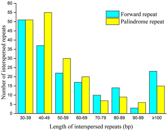 Supplementary File S2: Figure S2 displays three varieties of repetitive sequences present in V. bracteatum. Dispersed repeats are repetitive sequences spread unevenly across the genome []. A total of 370 dispersed repeats were identified (Supplementary File S1: Table S2), accounting for 8.98% (63,598 bp). Notably, 177 and 193 were forward repeats and palindromic repeats, respectively. The longest forward repeat had a length of 29,795 bp, whereas the longest palindromic repeat was 534 bp. The length of the forward repeats mainly ranged from 30–39 bp, whereas the length of the palindromic repeats was most prevalent between 40–49 bp (Figure 2).