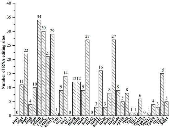 In this study, 360 RNA editing sites were predicted within 36 PCGs of the V. bracteatum mitogenome (Supplementary File S1: Table S5). As shown in Figure 3, the highest quantity of RNA editing sites was predicted in ccmB (34), followed by ccmC (30) and ccmFn (29). Only one editing site was predicted in cob, rpl5, rps1, and rps13. No potential RNA editing sites were predicted in genes atp1, cox3, nad3, and rps12, and in two pseudogenes (rpl16 and rps14). Due to RNA editing, the hydrophobicity of 40.28% of the amino acids was predicted to remain stable, 7.22% to change from hydrophobic to hydrophilic, and 51.11% to change from hydrophilic to hydrophobic.
