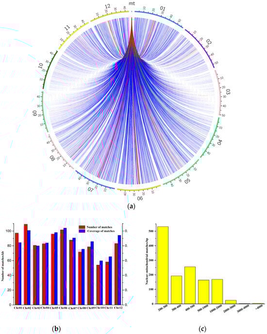 To investigate intergenomic fragment transfer events in V. bracteatum, the cp and nu genomes were searched by using its mitogenome sequences as queries [,]. A total of 4512 hits covering 1011.43 kb of sequences of the nuclear genome transferred into the mitogenome were obtained (Figure 5a). As shown in Figure 5b, each V. bracteatum chromosome exhibited hits, though the total lengths and the percent coverage of these hits differed. Chromosome 2 exhibited the longest total length of hits (109.14 kb), and the greatest percent coverage (0.21%) existed on chromosome 6. In addition, the most abundant fragment lengths were found within the range of 200–300 bp (Figure 5c). A total of 362.83 kb of sequences (51.22% of the V. bracteatum mitogenome) was shared between the nuclear and mitochondrial genomes (Supplementary File S1: Table S9). Numerous homologous segments within the nuclear genome contained several complete mitochondrial genes, including one PCG (ccmFn) and nine tRNA genes (trnS-GCT, trnS-TGA, trnM-CAT, trnL-CAA, trnF-GAA, trnG-GCC, trnW-CCA, trnK-TTT, and trnC-GCA).
