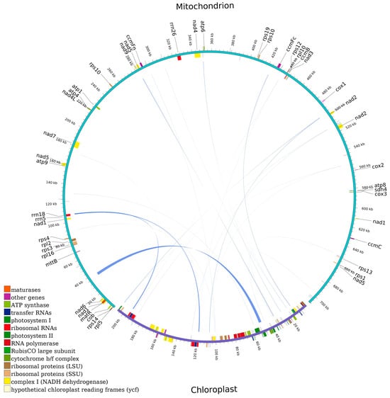 The mitogenome was searched against the cp genome using BLASTN with matching rate ≥ 70%, E-value ≤ 1 × 10−5, and length ≥ 30 bp. To identify regions of potential nuclear origin in the mitogenome of V. bracteatum, we also performed a BLASTN search of the complete mitogenome against the nuclear genome of V. bracteatum sequenced in our previous study (SRR29004627) with matching rate ≥ 80% and length ≥ 250 bp. Finally, data visualization was performed using circos v0.69-5 (http://circos.ca/software/download/; accessed on 3 January 2023).