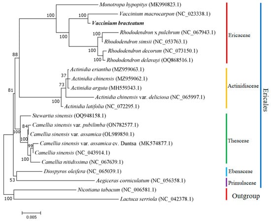 Based on the mitogenomes of V. bracteatum and 21 other plants, a phylogenetic tree was obtained (Figure 7). As outgroups, N. tabacum and L. serriola were distinct from the Ericales species. The species from five families, Ebenaceae, Primulaceae, Theaceae, Actinidiaceae, and Ericaceae, were well clustered into five separate branches, aligning with the findings of the APG IV taxonomic framework, a modern classification system of flowering plants strongly based on molecular phylogenetics []. Additionally, the phylogenetic tree provided strong evidence (bootstrap support = 100%) for the strong phylogenetic association between the target tree species V. bracteatum and V. macrocarpon, which both belong to the genus Vaccinium, and established a sister cluster with the genus Rhododendron in the Ericaceae family, supported by a bootstrap support value of 100% (Figure 7). Overall, the clustering observed in the phylogenetic tree aligned with the family-level relationships of these species, suggesting that the mitogenome clustering results were reliable. Furthermore, several species were selected for further comparative analysis based on the phylogenetic tree.