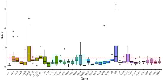 Boxplots of the Ka/Ks values of the shared PCGs among seven Ericales species.