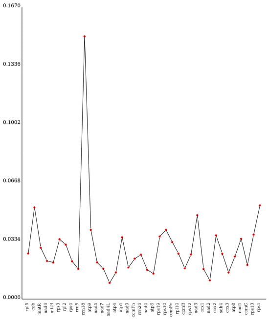 The Pi values of 35 PCGs and 3 rRNA genes ranged from 0.009 to 0.150 (Figure 9; Supplementary File S1: Table S12). Among them, rps1 (0.054) and cob (0.052) were highly variable. Conversely, the most conserved PCG was nad4L (0.009). Moreover, the Pi values of three rRNA genes varied greatly, with values of 0.017 for rrn5, 0.150 for rrn18, and 0.025 for rrn26. In general, the nucleotide diversity of the PCGs exhibited considerable variability across the seven Ericales mitogenomes.