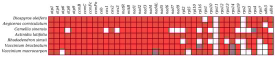 The mitogenome of the common ancestor of angiosperms contains 41 PCGs []. Most of these seven species possessed a full complement of 24 PCGs classified as core genes []. Nevertheless, several core genes were either absent (represented by white squares in Figure 10) or presented as incomplete sequences (pseudogenes; represented by grey squares in Figure 10). V. macrocarpon lacked the genes atp6 and nad4L, while the genes atp8, cox1, cox3, nad7, and nad9 were not found in C. sinensis. Conversely, the other 17 genes called variable PCGs were highly variable across the seven studied Ericales species. Specifically, we observed the absence and pseudogenization of rps and sdh. C. sinensis lacked eight genes belonging to these two categories, and several Ericales species commonly lacked rps2 and rpl11, with only A. latifolia containing rps2. Additionally, for seven species, we detected a total of five pseudogenes in three species (C. sinensis, V. bracteatum, and V. macrocarpon). The species V. bracteatum and V. macrocarpon both had two pseudogenes, while C. sinensis had only one (rps4). V. bracteatum and V. macrocarpon exhibited 31 shared PCGs.