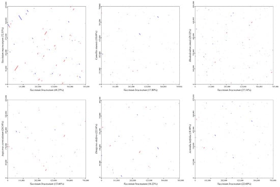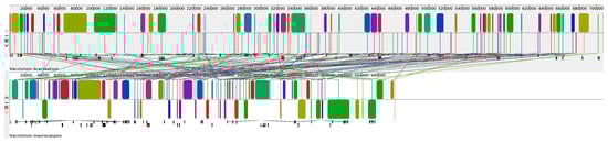 To further evaluate the structural variations, the mitogenome of V. bracteatum was compared to those of six Ericales species, including one Ebenaceae, one Primulaceae, one Theaceae, one Actinidiaceae, and two Ericaceae, and the V. bracteatum mitogenome was used as a reference. According to the dot-plot (Figure 11), the longest syntenic sequences showed the most significant similarity between V. bracteatum and V. macrocarpon, revealing a close genetic affinity between the two species. Despite high sequence similarity, collinearity analysis (Figure 12) showed that the arrangement of homologous co-linear blocks differed between the two mitogenomes. And the arrangement of PCGs was not consistent between the two Vaccinium mitogenomes, with many differences (Supplementary File S2: Figure S2). These significant rearrangement events suggested that the mitogenomes exhibited extreme structural non-conservation.