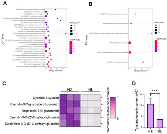 2.2. RNA-Seq and Metabolomic Analysis Showed That the Anthocyanin Biosynthesis Pathway Was Down-Regulated by Changes in Some TFs