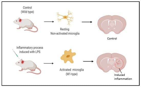 Preclinical models of neuroinflammation. Lipopolysaccharide from E. coli is injected in the brain to induce an inflammatory response. LPS increases the expression levels of proteins, promoting the activation of microglia [3].