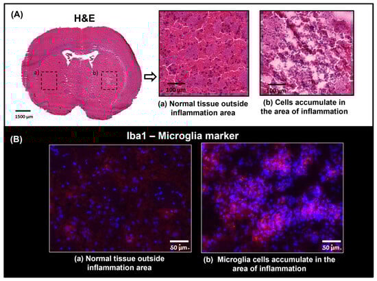 (A) H&E staining on a section treated with LPS. Optical images from the whole section and area of inflammation are shown. An accumulation of cells stained with Haematoxylin (blue) is observed in the area of inflammation (b), indicating possible infiltration of immune cells during the neuroinflammatory process. A region without inflammation from a corresponding region in the opposite hemisphere is also included (a), showing normal histomorphology in the striatum. (B) Immunofluorescence staining in consecutive section, showing the area where anti-Iba1 (in red) binds to resting or activated microglia.