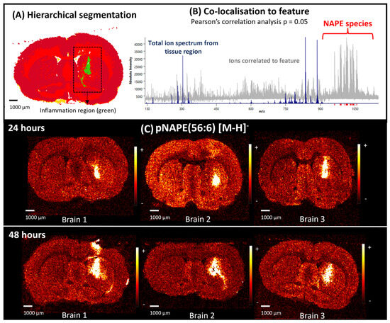 (A) Segmented total ion image by hierarchical clustering from a brain treated with LPS. The segmentation allowed the identification of regions that have spectral differences. Here, the inflammation region (green) was identified and selected for further analysis. (B) Co-localised values to a feature. Pearson correlation analysis was applied to obtain the ions specifically co-localised to the inflammation regions of brains treated with LPS. This was calculated using SCILS Lab with p = 0.05. Total ion spectra from the tissue region are shown in blue and the values correlated to the inflammation region are displayed in grey. NAPE lipid species were some of the ions co-localised to the inflammation area. (C) Single ion images of pNAPE(56:6) from all the biological replicates in the two time points (24 and 48 h). Accumulation of the NAPE lipid species was observed in the inflammation area in all the LPS-treated brains. All images were normalised to the total ion count.