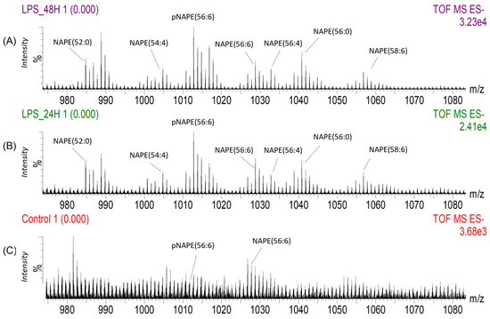 Summed total ion DESI mass spectra extracted from regions of interest with 100 pixels from (A) The inflammation area of the brain striatum treated with LPS and harvested after 48 h, (B) The inflammation region the striatum harvested after 24 h and (C) Region of the striatum from a non-treated brain (Control). These spectra show the higher signal intensity detected from several NAPE lipid species in the LPS-treated brains. Two of these NAPE species, pNAPE(56:6) and NAPE(56:6) are also detected in the control brain but their signal intensity is lower compared to the brains with inflammation, and they do not accumulate in any areas of the striatum.