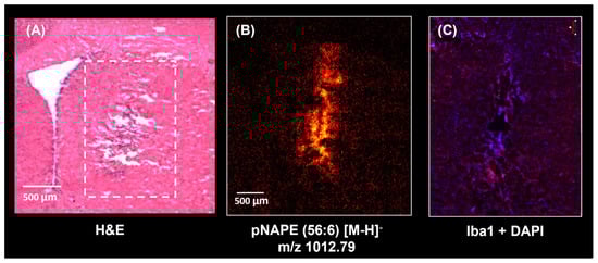 NAPE species were also observed when imaging serial sections using TOF-SIMS at a higher spatial resolution, as shown in Figure 5 and Figure S5 (Supplementary Information). Figure 5 displays a TOF-SIMS image focused on the neuroinflammation region, histological staining with H&E, and immunofluorescence. This image confirms the up-regulation of pNAPE(56:6) in the injury site and accumulation of cells and microglia. We did not observe accumulation of microglia outside the inflammation region (Figure 2). TOF-SIMS spectra from regions with and without inflammation were extracted and compared (Supplementary Figure S5). The main chemical differences between regions can be observed between m/z 900 and 1100, where different NAPE lipid species were putatively identified in the area with inflammation.