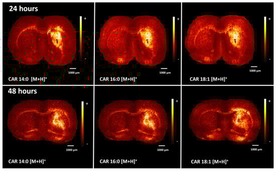 Accumulation of acylcarnitines was observed in the LPS-induced neuroinflammation models with MALDI and DESI imaging in positive ion mode harvested 24 and 48 h after the LPS injection. Figure 7 includes ion images showing the distribution of acylcarnitine species detected with MALDI. The species observed are tetradecanoylcarnitine (CAR 14:0) at m/z 372.31, palmitoylcarnitine (CAR 16:0) at m/z 400.34, CAR 18:1 that could be assigned as elaidic carnitine or o-oleoylcarnitine at m/z 426.35 and stearoylcarnitine (CAR 18:0) at m/z 428.37. These species were assigned according to their exact masses (Supplementary Table S4) as we could not detect enough signal to perform MS/MS in situ. The acylcarnitine ions are found in the same hemisphere of the brain where neuroinflammation developed, surrounding the injury region. These ion species were detected with DESI imaging in positive ion mode (Figure 7 and Supplementary Figure S7). Accumulation of acylcarnitines was not observed when analysing samples from control brains. The abnormal accumulation of acylcarnitine molecules surrounding the area of inflammation could indicate an increase in local oxygen demand leading to a hypoxic-driven β-oxidation cycle to break down fatty acids [29,40]. Alternatively, the accumulation could be linked to tissue oxidative damage and the subsequent dysfunction of the fatty acid β-oxidation cycle. This results from mitochondrial malfunction due to the abnormal production of reactive oxygen species (ROS) derived from proinflammatory molecules during acute neuroinflammation, such as LPS-induced neuroinflammation [41,42,43].