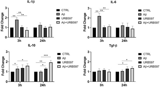 Here, we evaluated the expression of the IL-6, IL-1β, Tgf-β and IL-10 mRNA levels by qPCR at 3 h and 24 h after Aβ challenge and URB597 treatment. The results (Figure 1) demonstrate that IL-1β and IL-6 mRNAs increased 3 h after Aβ treatment (p = 0.0092; p = 0.0098), while URB597 alone did not induce any expression of pro-inflammatory cytokines. On the other hand, a reduction in pro-inflammatory cytokines was observed at 3 h following treatment with URB597 as compared to the effects produced by the challenge with Aβ only (p = 0.0064; p = 0.0079). No significant changes in the mRNA’s expression of both IL-1β and IL-6 were evident at 24 h. On the other hand, the expression of IL-10 at 3 h increased significantly following Aβ challenge (p = 0.045), although the co-treatment with URB597 also increased IL-10 mRNA expression (p = 0.037). The Tgf-β mRNA expression did not show significant changes at 3 h after treatment. At 24 h, the expression of IL-10 and TGF-β increased significantly in the presence of URB597 (p = 0.0071; p = 0.0083) as well as in the combined URB597 and Aβ co-treatment (p = 0.00061; p = 0.038) as compared to Aβ alone. Hence, URB597 decreased the expression of anti-inflammatory cytokines in the short term, considering their early kinetics and, simultaneously, induced the secretion of anti-inflammatory cytokines 24 h after treatment.