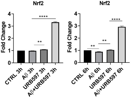 The M2 phenotype plays a role in the resolution of inflammation via the release of anti-inflammatory cytokines, such as IL-4, IL-10, and TGFβ, as well as through the expression of antioxidant factors such as Nrf2 (Nuclear factor erythroid 2-related factor 2) [17]. The activation of Nrf2, following the increase in ROS (reactive oxygen species), regulates SQSTM1/p62 (sequestosome 1) gene expression and influences autophagy activity. This mechanism is deregulated in neurodegenerative diseases by the exacerbation of oxidative stress and neuroinflammation [27]. We evaluated, via RT-PCR, the Nrf2 mRNA expression in URB597-treated or untreated BV-2 cells either in the absence or in the presence of Aβ. At 3 h after the Aβ challenge, Nrf2 mRNA did not show any significant variation, whereas following URB597 treatment, we detected a slight significant increase in Nrf2 (p = 0.002), and a strong significant increase with the combined treatment, i.e., URB597 + Aβ (p = 0.0000393). At 6 h after Aβ challenge, we found (Figure 2) a significant reduction in Nrf2 mRNA expression as compared to the CTRL cells (p = 0.0009), while following URB597 treatment, Nrf2 mRNA expression increased significantly also in the BV-2 cells challenged with Aβ (p = 0.0033; p = 0.000092). Thus, under stress neuroinflammatory conditions, URB597 promoted the increase of Nrf2 mRNA expression.