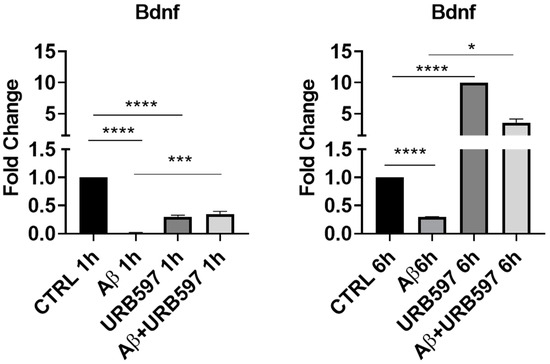 To further explore the neuroprotective potential of URB597, we additionally evaluated the mRNA expression of Bdnf. promotes neuroprotection and modulates the synaptic interaction that is critical for cognition and memory, by increasing survival and inducing neuronal regeneration [28,29]. BDNF deficiency in AD contributes to neurodegeneration [30]. In particular, we assessed whether URB597 treatment was able to change BDNF mRNA expression in BV-2 cells either in the absence of or in the presence of Aβ challenge. As shown in Figure 3, there was a significant reduction in Bdnf mRNA expression in the presence of Aβ as compared to the untreated cells (CTRL) at both 1 h and 6 h after Aβ challenge (p = 0.000012; p = 0.00004). After 1 h, URB597 significantly increased BDNF mRNA expression in the presence of Aβ as compared to BV2 cells challenged with Aβ (p = 0.0002). At 6 h, Bdnf mRNA expression increased significantly in both URB597-treated cells (p = 0.000023), and in the combined treatment of Aβ + URB597 (p = 0.0143).