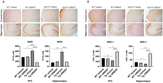 Immunohistochemical analysis (Ematoxillin and DAB chromogen) in sagittal sections of PFC and hippocampus. (A) shows decreased iNOS marking in Tg2576 mice treated with URB597; (B) shows increased ARG-1 marking in Tg2576 mice treated with URB597; these results were confirmed by quantification shown in graphs. Analysis was performed by considering 4 10× magnification fields for both hippocampus and cortex, and values were expressed as mean ± SD of total positive cells expressed in both brain regions from 6 independent experiments for each experimental group using unpaired Student t test. Significance levels were denoted as follows: * p < 0.05, ** p < 0.01, **** p < 0.0001.