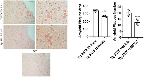 Congo Red analysis in sagittal sections including either vehicle or URB597-treated Tg2576 mice. Images show amyloid plaques. Analysis was performed by considering 4 magnification fields; area was expressed in μm2 and values were expressed as mean ± SD of total positive cells expressed in both brain regions from 6 independent experiments for each experimental group, using unpaired Student t test. Significance levels were marked as follows: *** p < 0.001, and **** p < 0.0001. Magnification 10× and 40×.