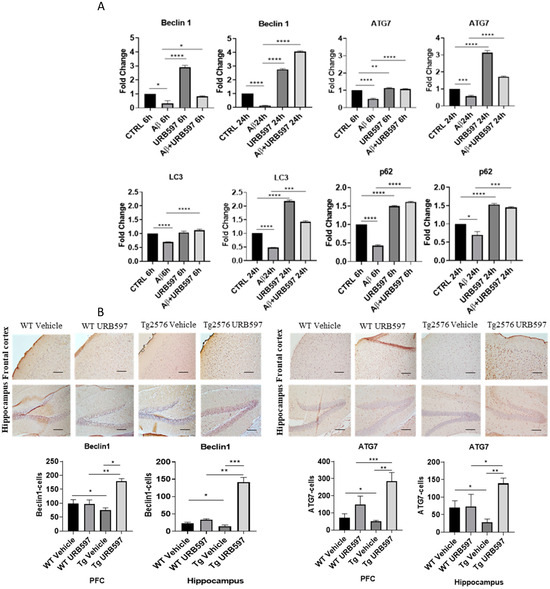 Analysis of mRNA expression of factors involved in the autophagic process. (A) mRNA expressions were evaluated by qRT-PCR at 6 h and 24 h of Atg7, BECN1, Lc3, and SQSTM1/p62. Data are shown as the mean ± SD from three independent experiments performed in triplicate. Expression profiles were determined using the 2−ΔΔCT method. Significance levels were denoted as follows: * p < 0.05, ** p < 0.01, *** p < 0.001, **** p < 0.0001. (B) Immunohistochemical analysis (Ematoxillin and DAB chromogen) in sagittal sections of vehicle-treated WT and Tg2576 experimental groups and WT and Tg2576 treated with URB597. The images show ATG7- and BECN1-positive cells in PFC and hippocampus. Analysis was performed by considering 4 10× magnification fields for both hippocampus and PFC, and the values were expressed as the mean ± SD of the total positive cells expressed in both of the brain regions from 6 independent experiments for each experimental group using an unpaired Student t test. Significance levels are indicated as follows: * p < 0.05, ** p < 0.01, *** p < 0.001. (C) Immunohistochemical analysis (Ematoxillin and DAB chromogen) in sagittal sections of vehicle-treated WT and Tg2576 groups and WT and Tg2576 administered with URB597. The images show the LC3I-II- and SQSTM1/p62-positive cells in the PFC and hippocampus. Analysis was performed by considering four 10× magnification fields from the hippocampus and PFC, and the values were expressed as the mean ± SD of the total positive cells expressed in both of the brain regions from 6 independent experiments for each experimental group, using an unpaired Student t test. Significance levels are indicated as follows: * p < 0.05, ** p < 0.01.