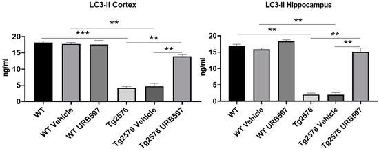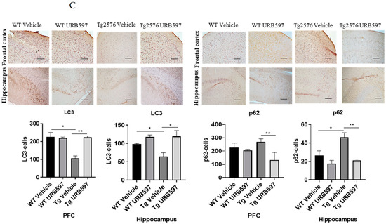 The precursor proLC3 was cleaved to form LC3-I and then modified via the conjugation to the phosphatidylethanolamine into the membrane-bound protein LC3-II, which has been characterized as an autophagosome marker in mammalian cells [33]. Our results confirmed the activity of autophagy in URB597-treated Tg2576 mice as shown by the significant increase via LC3-II expression in the hippocampus and PFC homogenates (Figure 7) compared to untreated (p = 0.026) and vehicle-treated Tg2576 mice (p = 0.0062).