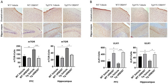 Immunohistochemical analysis (Ematoxillin and DAB chromogen) in sagittal sections of vehicle-treated WT and Tg2576 experimental groups and WT and Tg2576 treated with URB597. (A) The images show mTOR positive cells in the PFC and the hippocampus. Analysis was performed by considering 4 10× magnification fields for both hippocampus and PFC, and the values were expressed as the mean ± SD of the total positive cells expressed in both the brain regions from 6 independent experiments for each experimental group using an unpaired Student t test. Significance levels were denoted as follows: * p < 0.05, ** p < 0.01, *** p < 0.001. (B) The images show ULK1-positive cells in the PFC and the hippocampus. Analysis was performed by considering 4 10× magnification fields for both the hippocampus and the PFC, and the values were expressed as mean ± SD of the total positive cells expressed in both of the brain regions from 6 independent experiments for each experimental group using an unpaired Student t test. Significance levels were denoted as follows: * p < 0.05, *** p < 0.001.