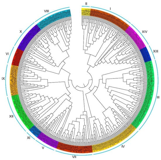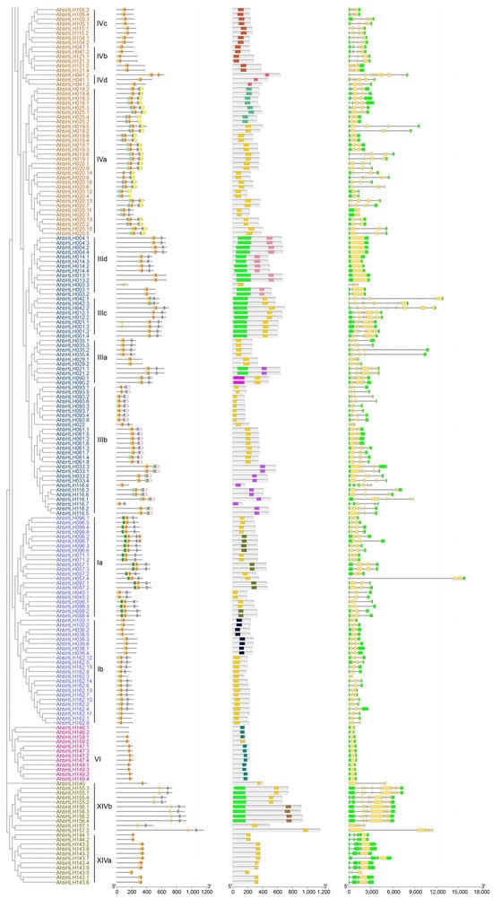 To reveal the phylogenetic relationship among AhbHLH genes, a phylogenetic tree was constructed with 535 bHLH protein sequences from peanut and Arabidopsis (Figure 1 and Figure 2A). As presented in Figure 1, bHLH gene members were divided into 14 groups (subfamilies), and each group contained 7 to 60 genes in peanut (Table S2). Interestingly, although the number of protein sequences in our study is three times higher than that of Heim et al. [], the classification is identical except Group VI and VII, which are merged into Group VII in this study. In addition, three novel groups (Group VI, XIII, and XIV) were identified (Figure 1, Table S2). Group VI contained eight Arabidopsis AtbHLH proteins (AtbHLH146/147/148/149/150/151/158/159) and 13 peanut AhbHLH proteins (AhbHLH146.1/.2, AhbHLH147.1/.2/.3/.4, AhbHLH149.1/.2/.3/.4, AhbHLH151, AhbHLH159.1/.2). Group XIII consisted of four Arabidopsis AtbHLH proteins (AtbHLH134/135/136/161) and 14 peanut AhbHLH proteins (AhbHLH134.1/.2/.3/.4, AhbHLH135.1/.2/.3/.4/.5, AhbHLH161.1/.2/.3/.4/.5). Group XIV consisted of nine Arabidopsis AtbHLH proteins (AtbHLH142/143/144/145/152/155/156/157/160) and 22 peanut AhbHLH proteins (AhbHLH140, AhbHLH143.1/.2/.3/.4/.5/.6/.7/.8/.9, AhbHLH144.1/.2, AhbHLH155.1/.2/.3/.4, AhbHLH156.1/.2/.3/.4, AhbHLH157.1/.2).