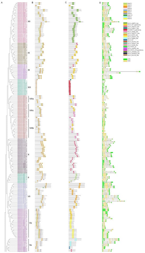Significant variation was observed in the exon–intron organization among AhbHLH genes (Figure 2D). The number of exons and introns ranged from 1 to 11 and from 0 to 10, respectively. The exon–intron organization was generally similar within most of the 14 phylogenetic groups. Although large variations of exon–intron organization were detected in Group III, IV, V, VII, and VIII, it was similar in the subgroups. Therefore, the exon–intron organization further supports the phylogenetic groups or subgroups defined here.