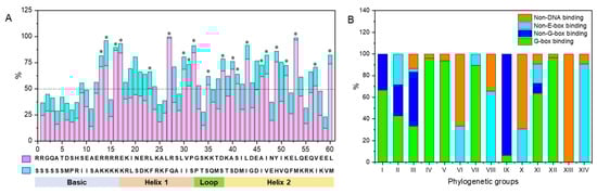 As for the phylogenetic groups, Groups I, II, III, IV, V, VII, IX, XI, and XII are mainly composed of E-box-binding proteins, while no E-box-binding proteins were found in Groups VI, VIII, XIII, and XIV (Figure 3B). The G-box binders form the majority of Groups IV, V, VII, and XII and part of Groups I, II, III, IX, and XI. The non-G-box binders form the majority of Group IX and part of Groups I, II, III, and XI. The non-DNA-binding proteins were found in all phylogenetic groups except Groups I, II, and IX. These data indicate that the different phylogenetic groups may have evolved different physiological functions based on their specific recognition of DNA binding sites.