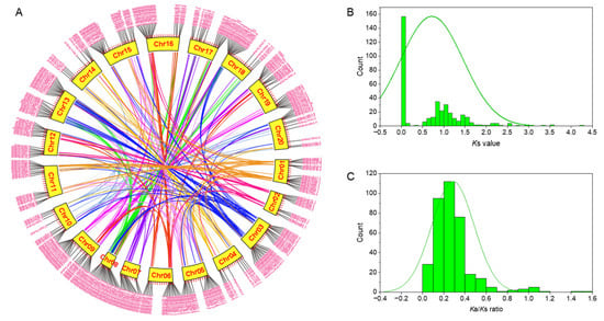 Collinear blocks (A) and distribution of Ks (B) and Ka/Ks (C) of duplicated peanut AhbHLH genes obtained from collinearity analysis.