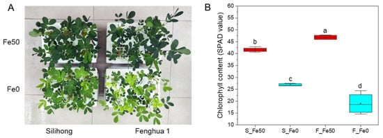 Plant morphology (A) and leaf chlorophyll contents (SPAD values) (B) of Silihong (S) and Fenghua 1 (F) grown under Fe-sufficient (Fe50) and -deficient (Fe0) conditions for 14 days. Data (means ± SE, n = 4) sharing the same letter(s) above the error bars are not significantly different at the 0.05 level based on the Duncan multiple range test.