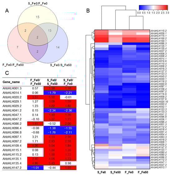 Identification of DGEs from the AhbHLH gene family in Fenghua 1 (F) and Silihong (S) under Fe-sufficient (Fe50) and Fe-deficient (Fe0) conditions. (A) Venn diagrams of the 55 DEGs among three comparisons. (B) Heatmap and hierarchical clustering analysis of the 55 DEGs identified in the AhbHLH gene family. (C) The log2FC values of the 19 DEGs shared by at least two comparisons. Red and blue color represents up- and downregulated DEGs, respectively.