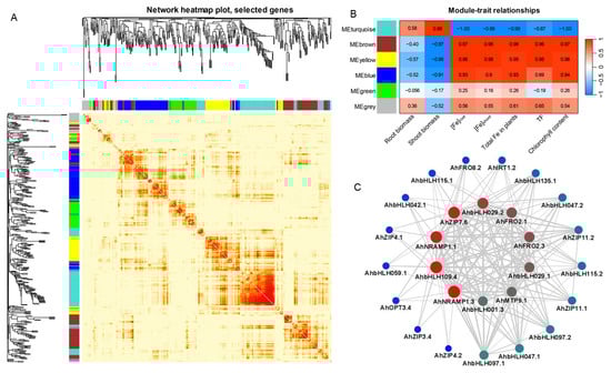 To identify the AhbHLH genes responsible for Fe deficiency resistance in peanut and reveal the possible regulatory network, a weighted correlation network analysis (WGCNA) was performed on TPM (Transcripts Per kilobase of exon model per Million mapped reads) data of 500 genes from AhbHLH, AhZIP, AhOPT, AhMTP, AhNRAMP, AhHMA, AhNAS, and AhFRO families. Six different modules were identified based on the co-expression patterns, which are marked with branches in different colors (Figure 7A). Among them, the blue module exhibited the most significant correlation with chlorophyll contents (r = 0.99) (Figure 7B). Since chlorophyll content is considered to be an important parameter indicating Fe deficiency in plants, we believe that the blue module is a Fe-deficiency-responsive module. Therefore, the blue module was further analyzed for visualization through Cytoscape 3.9.1 with a weight threshold of 0.3. As presented in Figure 7C, 15 AhbHLH genes were included in the constructed gene network, including AhbHLH001.3, AhbHLH029.1/.2, AhbHLH036.1, AhbHLH042.1, AhbHLH047.1/.2, AhbHLH059.1, AhbHLH068.3, AhbHLH097.1/.2, AhbHLH109.4, AhbHLH115.1/.2, and AhbHLH135.1. These AhbHLH genes co-expressed in peanut roots with nine AhZIP genes, three AhFRO genes, two AhNRAMP genes, and two AhOPT genes, as well as AhMTP9.1 and AhNAS2.1 (Figure 7C).