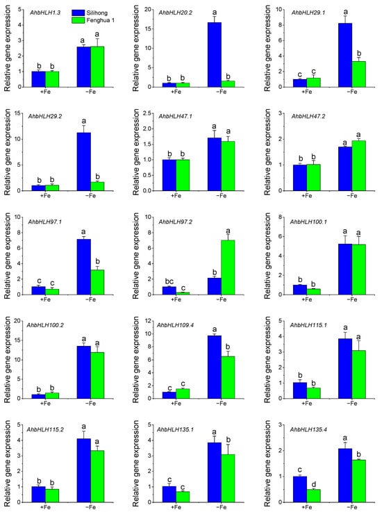 RT-qPCR validation of 15 selected AhbHLH genes in roots of Silihong and Fenghua 1 under Fe-sufficient (+Fe) and Fe-deficient (−Fe) conditions. Data (means ± SE, n = 3) sharing the same letter(s) above the error bars are not significantly different at the 0.05 level based on the Duncan multiple range test.
