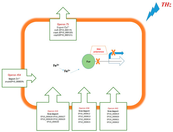 We can hypothesize that under the action of THz irradiation, repression of the above-mentioned operons that control the import of iron and zinc is mediated by TFs of the Fur family in two stages and through different mechanisms. At the first stage, THz irradiation stimulates the transition of Fe3+ to Fe2+ and of other metals—which interact with TFs of this family—into the divalent state, thereby enhancing the binding of a TF to DNA, and consequently the repression of the operon through sites located in the operator zone of the promoter (Figure 1). The resulting decrease in intracellular levels of iron and zinc causes even stronger inhibition of Fur-dependent transcription through sites that act as repressors during an iron and/or zinc deficit.