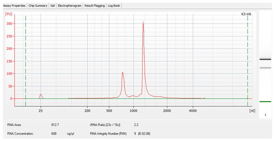 The impact of THz radiation on the cell transcriptome was analyzed by RNA sequencing on the Illumina massively parallel sequencing platform. Total RNA from bacterial cells was isolated by means of the Qiagen RNA Mini Kit, with modifications to the manufacturer’s protocol. Namely, to a frozen cell pellet, 100 μL of the RNAprotect Bacteria Reagent was added. After thawing, the cells were carefully resuspended by pipetting and incubated for 5 min at room temperature. The cells were pelleted by centrifugation for 3 min at 4000× g. Next, 80 μL of TE buffer containing 15 mg/mL lysozyme was added to the precipitate, which was resuspended and incubated for 5 min. After that, 10 μL of a proteinase K solution was added to the cells with incubation for 5 min. Next, 5 μL of 10% SDS was added to the cells, and the cells were ground in an Eppendorf tube by means of a plastic pestle. After that, lysis was carried out by the addition of 700 μL of Buffer RLT with mercaptoethanol followed by pipetting, after which 500 μL of 80% EtOH was introduced, and after mixing, all the liquid was applied to the column and centrifuged for 30 s at 8000× g. The column was washed with 700 μL of Buffer RW1, after which the column was transferred to a new Collection Tube and washed twice with 500 μL of Buffer RPE. Then, RNA was eluted with 30 μL of RNase-free water. After the isolation, the quality of the RNA was assessed on a BA2100 bioanalyzer using the RNA Nano kit. The isolated RNA showed no signs of degradation (Figure 3), and RNA concentration was determined fluorometrically on the Qubit instrument with the RNA High Sensitivity Kit.