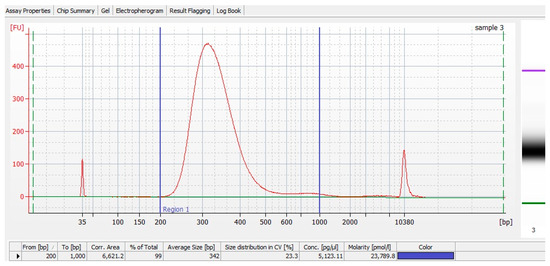 To generate 12 barcoded RNA-Seq libraries, the TruSeq Stranded mRNA Library Prep Kit was utilized according to the manufacturer’s protocol with several modifications. Namely, 10–15 ng of ribo-depleted RNA was used directly from the RNA fragmentation stage; the preceding selection steps were omitted. RNA in a 4.3 μL solution was added to 4.3 μL of the Fragment, Prime, Finish Mix; fragmentation was conducted for 8 min, and subsequent steps were performed in accordance with the manufacturer’s protocol. Twelve PCR cycles were used to amplify the libraries; final purification was carried out on AMPure XP magnetic beads. TruSeq RNA Single Indexes Set B was chosen. The quality of the resulting libraries and their molarity were checked on the BA2100 Bioanalyzer with the DNA High Sensitivity Kit; the libraries were diluted 1:10 before application to the bioanalyzer (Figure 4). The molarity of the obtained libraries was in the range of 20–45 nM.