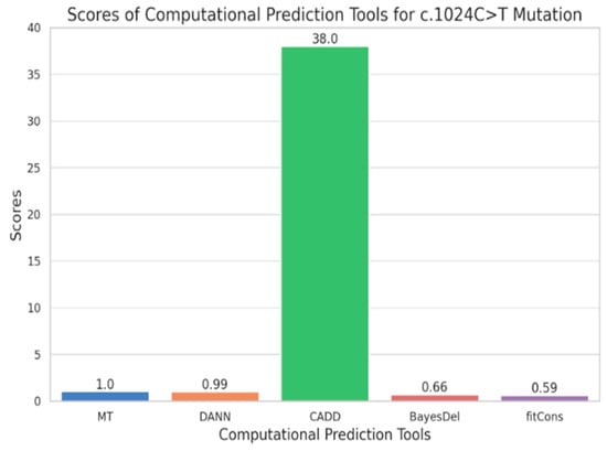The statistical analysis revealed a mean score of about 8.25 with a standard deviation of 16.63, which indicates significant pathogenic variation among the tools. The ANOVA shows statistically significant differences in value (statistic = 51,964.49, p-value < 0.001). Furthermore, a correlation matrix showed a perfect correlation (1.0) among the scores, which indicates that while each tool employs a different scoring system, their outputs collectively contribute to assessing the pathogenicity of variants. A bar graph showing the scores assigned by each tool will further highlight CADD’s dominance in predicting the deleteriousness of the c.1024C>T variant, underscoring the importance of integrating multiple computational tools in assessing the effect of mutation.