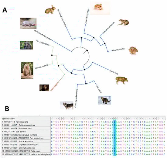 (A) Phylogenetic tree of the PPARγ gene. (B) Nucleotide sequence alignment of human and primate PPARγ genes. The asterisk marks a conserved region across different species, while the blue background indicates the identified mutation. Different colors highlight the nucleotides: Adenine (A), Thymine (T), Cytosine (C), and Guanine (G) for clarity.