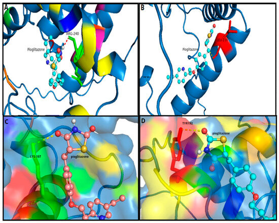 Through using the AutoDock Vina program [13], we docked the PPARγ protein (wild-type and mutant) with the Pioglitazone ligand, and we found two unique binding sites associated with the mutant form. The docking binding affinity of the Pioglitazone ligand complex and wild-type PPARγ was −5.854 and −5.416 (kcal/mol), whereas the Pioglitazone ligand complex and mutant PPARγ protein was −5.957 and −6.026 (kcal/mol). LYS-197 (Lysine) and ARG-240 (Arginine) are the wild-type residues we found that interact with Pioglitazone. Conversely, mutants form interaction residues with TYR-192 (Tyrosine) and LEU-239 (Leucine) (Figure 4 and Figure 5).