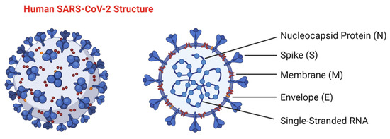 SARS-CoV-2 structure. Structural elements of the virus, including the spike (S) glycoprotein (homotrimer), membrane (M) protein, envelope (E) protein, and internal components, such as the viral single-stranded RNA and nucleocapsid (N) protein. Created in BioRender. B, L. (2024) BioRender.com/q94f155, accessed on 16 September 2024.