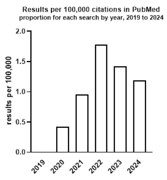 The number of published papers from 2019 to 2024 (until October 28.) containing the combined keywords “alpha-synuclein” and “COVID-19”. The results are presented as the proportion of citations per 100,000 in PubMed for each year. Data sourced using PubMed by Year: http://esperr.github.io/pubmed-by-year, accessed on 28 October 2024.