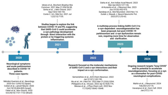 These mechanisms include the viral-induced dysfunction of α-syn resulting from direct protein–protein interactions that accelerate the conversion of α-syn into pathological multimeric forms, such as oligomers and protofibrils, promoting its spread and leading to widespread neurodegeneration. Additionally, chronic neuroinflammation triggered by SARS-CoV-2 may cause pathological changes in α-syn, further supporting a potential connection between these disorders.