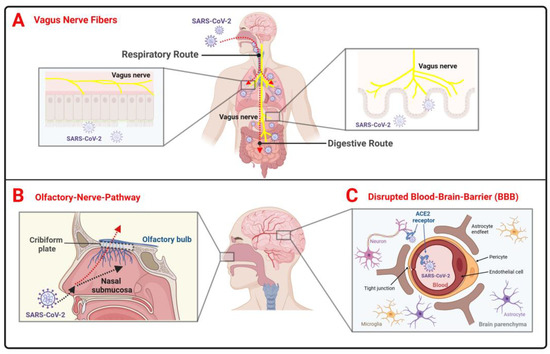 The hypothesis of neuroinvasion by SARS-CoV-2 arises from the detection of virus RNA in the cerebrospinal fluid (CSF) of COVID-19 patients [78]. Although research into how the virus may invade the nervous system is ongoing, several key neuroinvasive pathways have been proposed. The virus might enter the central nervous system (CNS) directly through the olfactory nerve pathway, using the vagus nerve through its terminals located along the respiratory and gastrointestinal tract, as well as via the neuroinflammation-affected blood–brain barrier (BBB) [21,79] (Figure 4).
