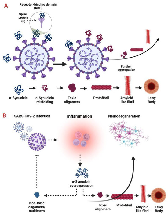 SARS-CoV-2–induced alterations in α-synuclein. (A) Potential direct interactions between the SARS-CoV-2 spike (S) protein and α-synuclein. The S protein may directly interact with α-synuclein, potentially altering its structure and increasing its propensity to misfold and aggregate. This interaction could encourage the formation of toxic α-synuclein oligomers or fibrils, which are harmful to neurons. (B) SARS-CoV-2–induced activation of α-synuclein’s immunomodulatory function. α-Synuclein plays a role in the immune system, including the modulation of inflammatory responses. When SARS-CoV-2 infects a cell, it initiates inflammatory signaling that involves microglial activation and the release of high levels of pro-inflammatory cytokines and chemokines. This inflammatory response may lead to α-synuclein accumulation and neuronal damage. Conversely, non-toxic multimers of α-synuclein could help prevent viral spread. Created in BioRender. Pan, I. (2024) https://BioRender.com/r11e475, accessed on 30 October 2024.